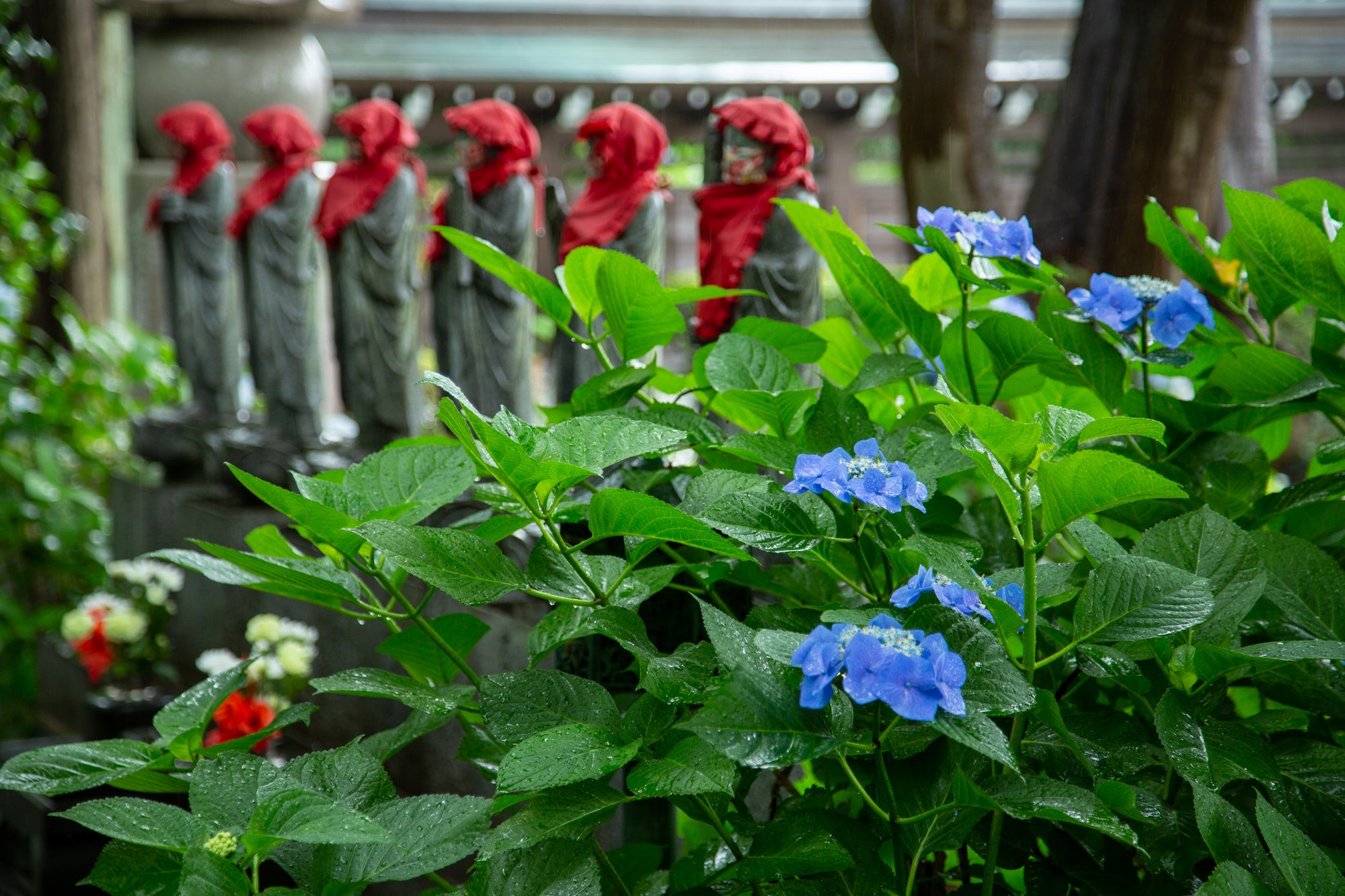 お地蔵さんが被る赤い布と、紫陽花の青々しさとのコントラストが綺麗に映えます。
