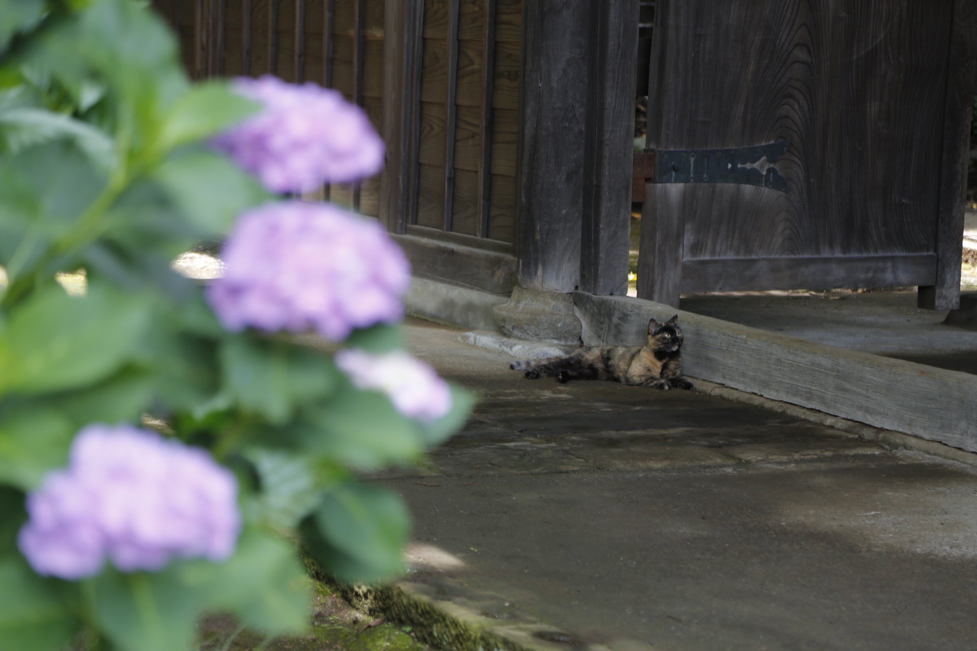 妙楽寺を徘徊する猫に運よく出会えたら、一緒に撮影してみるのもおすすめです。