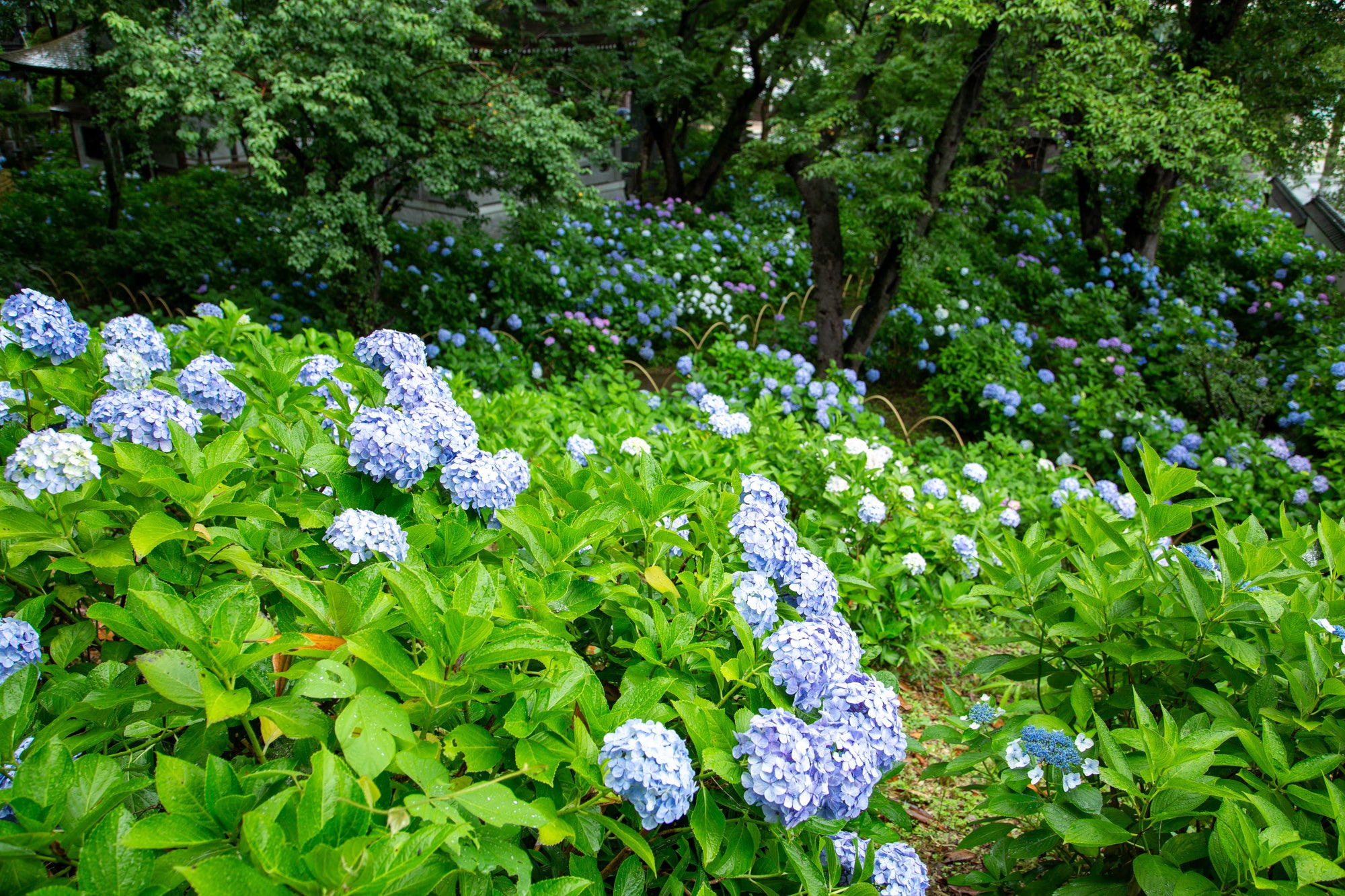 高台にある境内からは、川崎市内を一望することができ、晴れた日には東京スカイツリーを眺めることができます。穏やかな街並みを望みながら、青・紫・薄紅色・白色など鮮やかに染まった紫陽花風景が楽しめます。