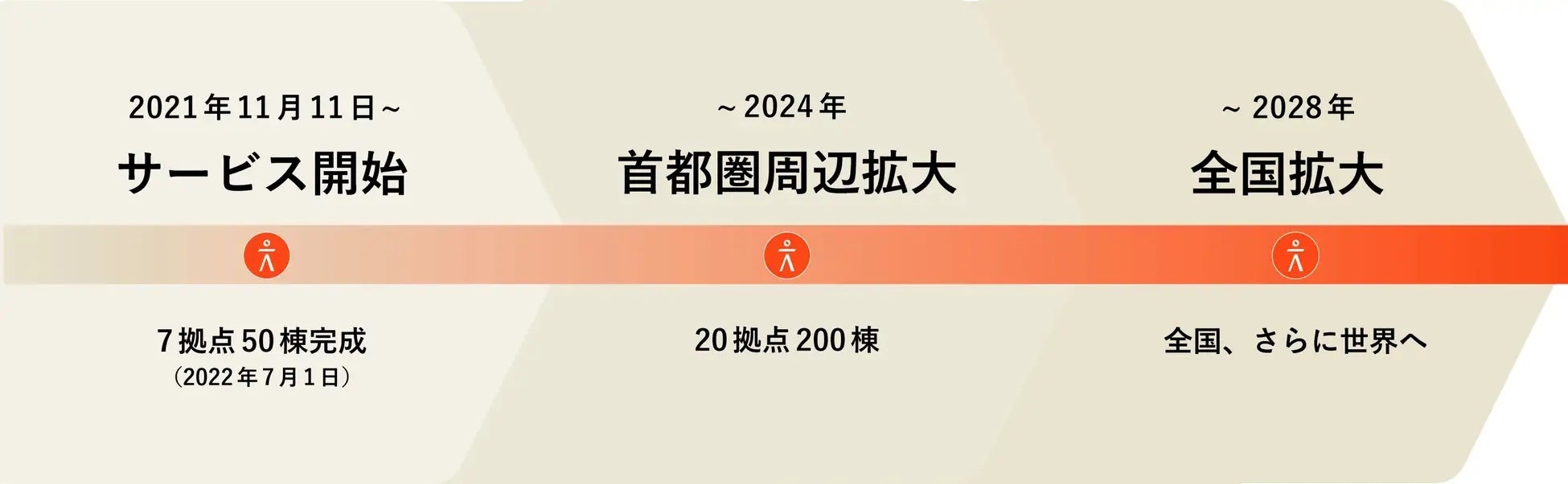 カーボンネガティブを実現する独自の建築モデルとテクノロジーの活用でスピード感をもって拠点開発を進め、2021年 11 月にサービス開始、 2022 年7月に7拠点50棟が完成・運用を開始。SANUが広がるほど自然が豊かに、地域経済にも寄与する<リジェネラティブ(自然再生)な仕組み>を実践していきます。