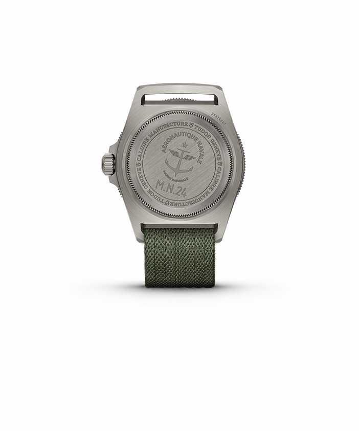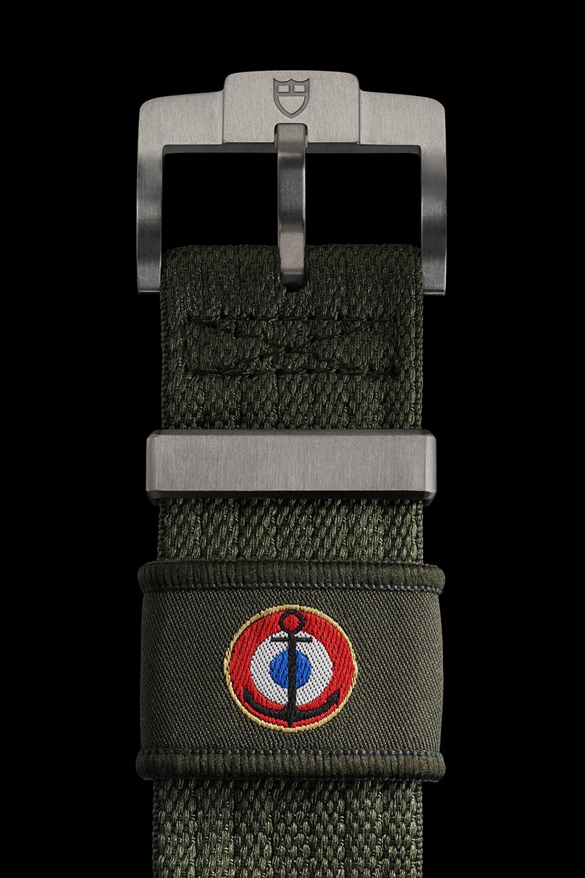 チューダーは2010年にいち早くファブリックストラップを採用して以来、常に先駆者であり続けている。フランスのサン・テティエンヌで150年以上家族経営を続けるジュリアン・フォール社によって、19世紀製の織機を用いて生み出されるファブリックストラップ。それは品質と快適さを両立する唯一無二の存在である。ペラゴス FXDのためにジュリアン・フォールとチューダーは、新しい構造の高性能ストラップを開発した。22 mmグリーンポリエステル製織りリボンのストラップは、グレード2 チタニウム製ピンバックルとキーパー、フランス国旗のブルー、ホワイト、そしてレッドのフランス海軍航空隊のラウンデルがゴールドで縁取られ、ブラックの錨が施された取り外し可能なファブリックバンドキーパーを備えている。