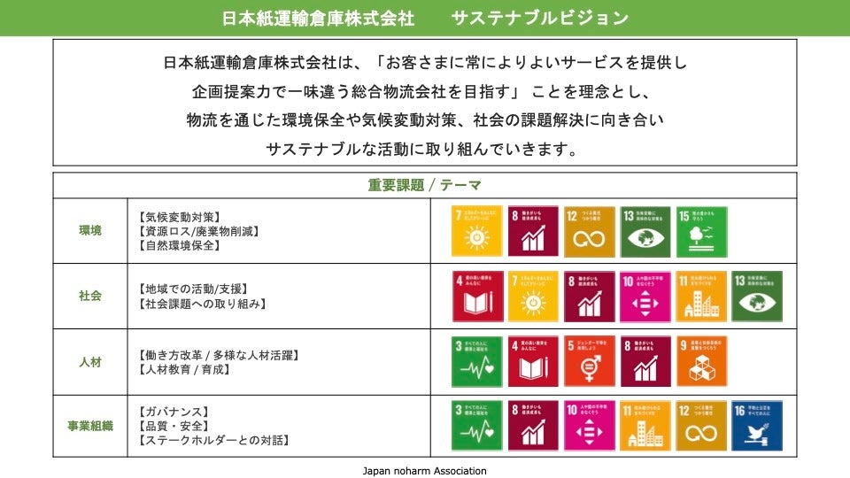 日本紙運輸倉庫株式会社 ( 所在地:東京都千代田区 代表取締役:山田隆 )は、SDGsに取り組む企業を対象としたサステナブル経営支援サービスを提供する一般社団法人日本ノハム協会( 代表理事:神田尚子 ) とメンバーシップを締結し、「お客さまに常によりよいサービスを提供し、企画提案力で一味違う総合物流会社を目指す」 ことをビジョンに掲げ、物流を通じた環境保全や気候変動対策、社会の課題解決に向き合うサステナブルビジョンを策定しました。
