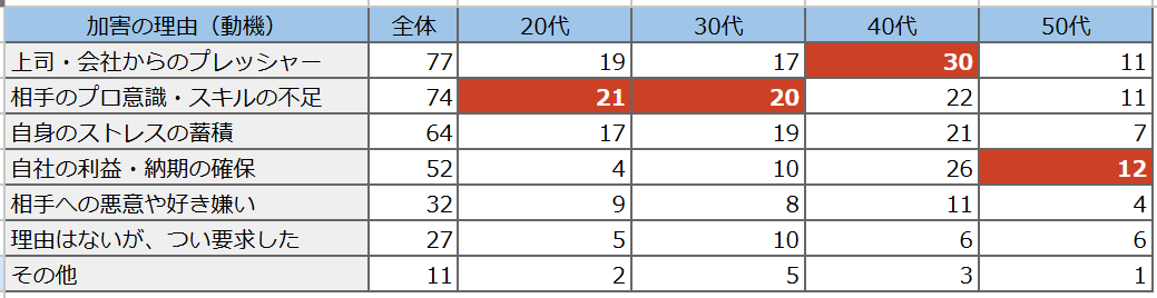 加害の理由を年代別に分析したところ、要求経験がもっとも多い40代では