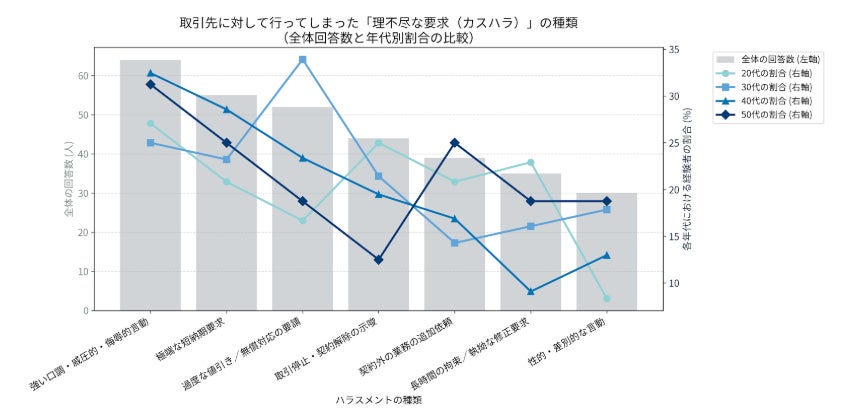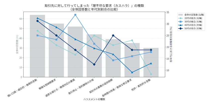 年代別に見ると、特に30代で、「過度な値引き/無償対応の要請」、40代では「極端な短納期要求」が他の年代と比べてその割合が突出しています。