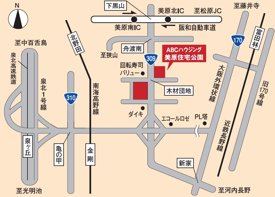 または南海高野線「北野田」駅から近鉄バス「木材団地」停留所下車