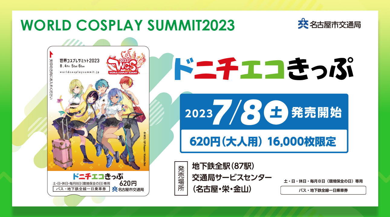 土曜日・日曜日・休日及び毎月8日(環境保全の日)に市バス・地下鉄が1日乗り放題になるドニチエコきっぷを世界コスプレサミットオリジナルデザインで7月8日より発売いたします。