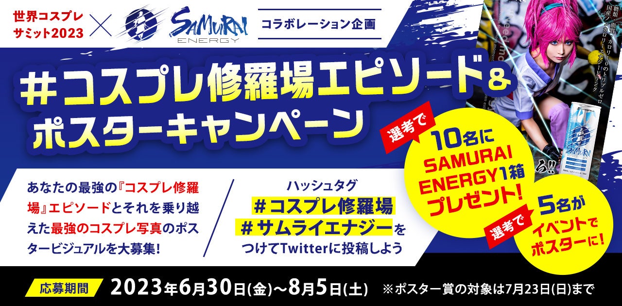 Twitterにあなたの最強のコスプレ『修羅場』に関するエピソードと、修羅場を乗り越えた最強のコスプレ写真を投稿して国産エナジードリンク「SAMURAI ENERGY」をGETしよう!ポスタービジュアルに選ばれたコスプレ写真は、世界コスプレサミット2023 SAMURAI ENERGY 出展ブースにてポスターとして展示されます。