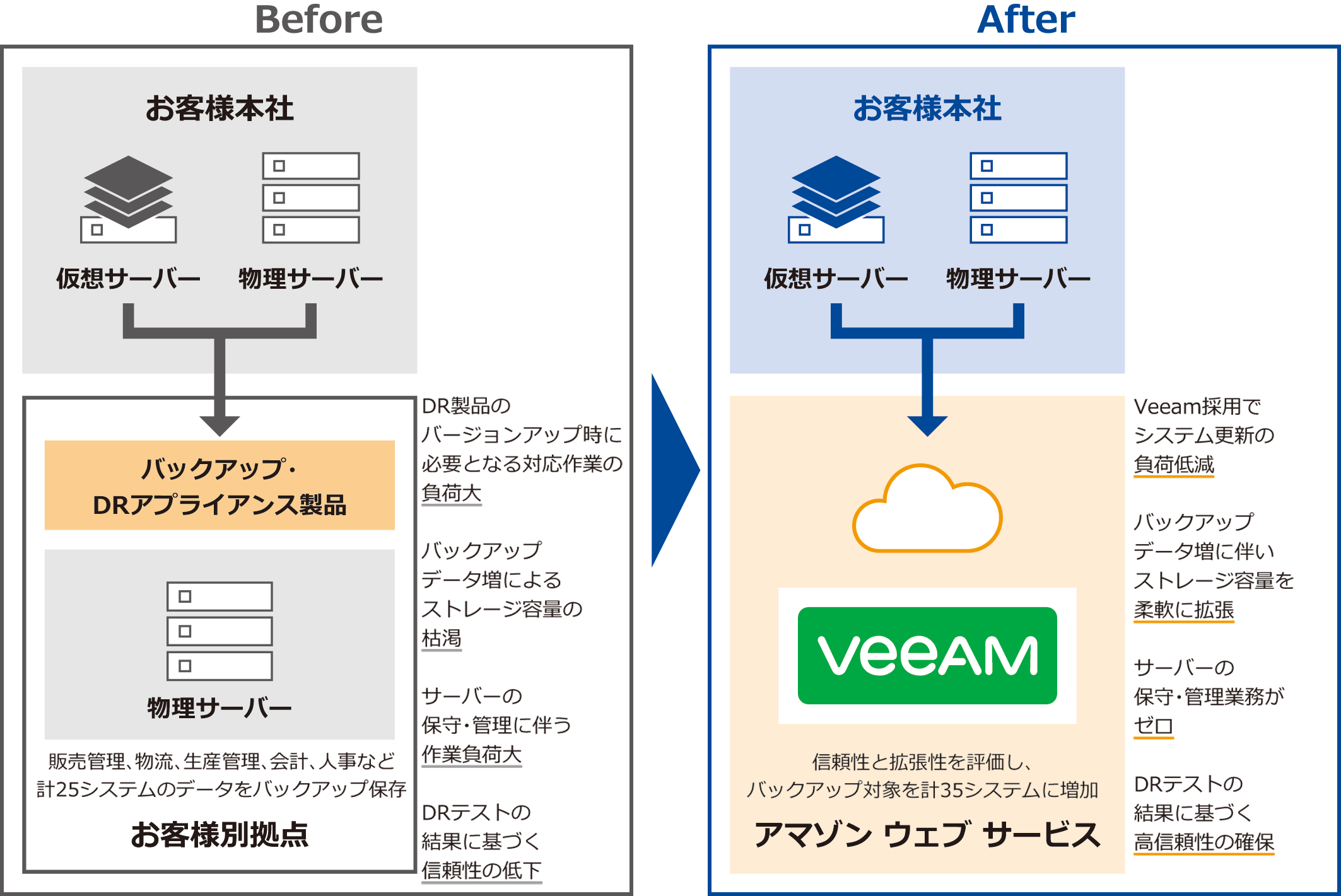 柔軟性の高いAWSの特長を最大限に活かすことで十分なバックアップが可能になり、システム全体の信頼性が向上。「Veeam Backup & Replication」の不具合通報機能により運用監視作業が軽減され、時間の拘束からも解放されました。バージョンアップに伴う作業だけでなく、DRテスト作業も軽減、有事の際の想定復旧速度も維持でき、運用コストも30%削減しました。
