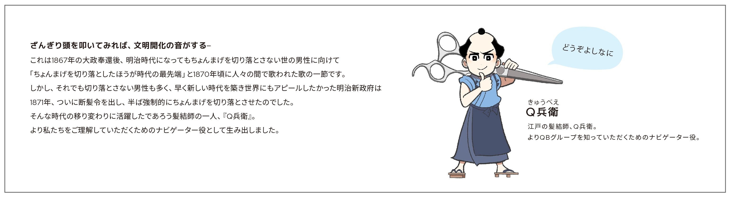 馴染みの少ないスタークホルダーの皆さまに、専門用語を極力使わず、より分かりやすく作成しており、また、海外でも店舗を展開していることも鑑み、江戸から明治に移り行く激動の時代に活躍したであろう髪結師を独自のキャラクターとして用い、親近感と面白味、日本発祥の想いを加えました。