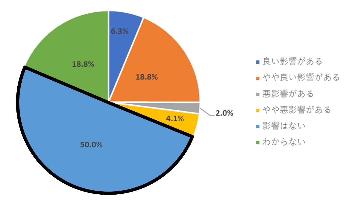 過去半年以内の賃上げ実施有無について聞いたところ、「はい」が41.7%、「いいえ」が58.3%という結果に。また、賃上げを実施した企業の内、今年度のボーナス支給額への影響については「良い影響がある」が6.3%、「やや良い影響がある」が18.8%という回答に。「悪影響がある」は2.1%、「やや悪影響がある」は4.2%、「影響はない」が50.0%であった。