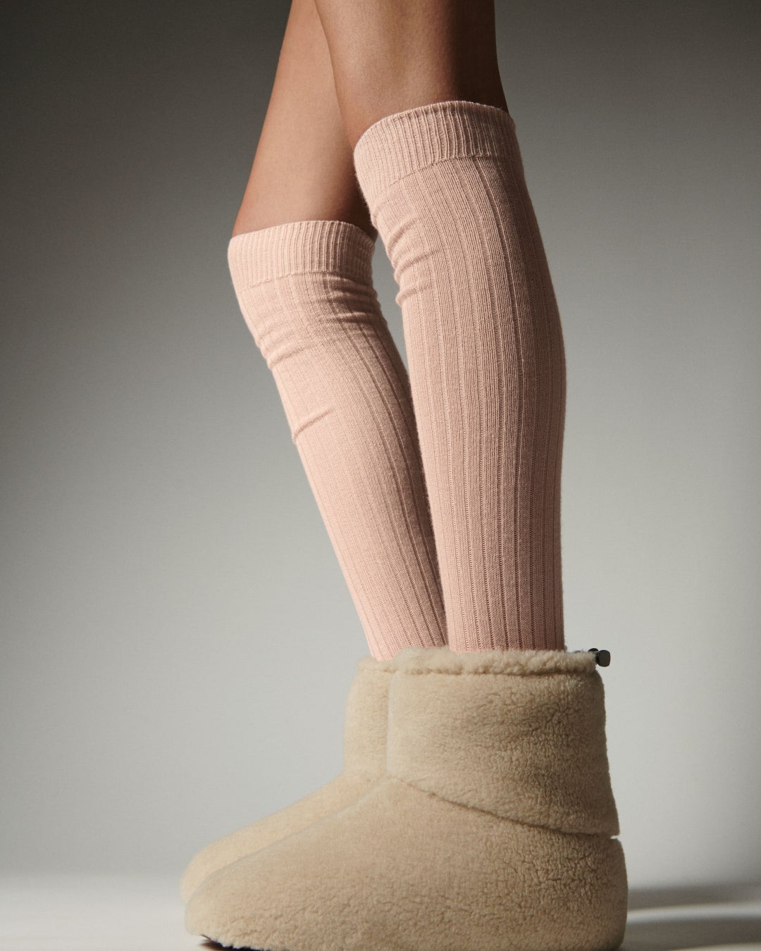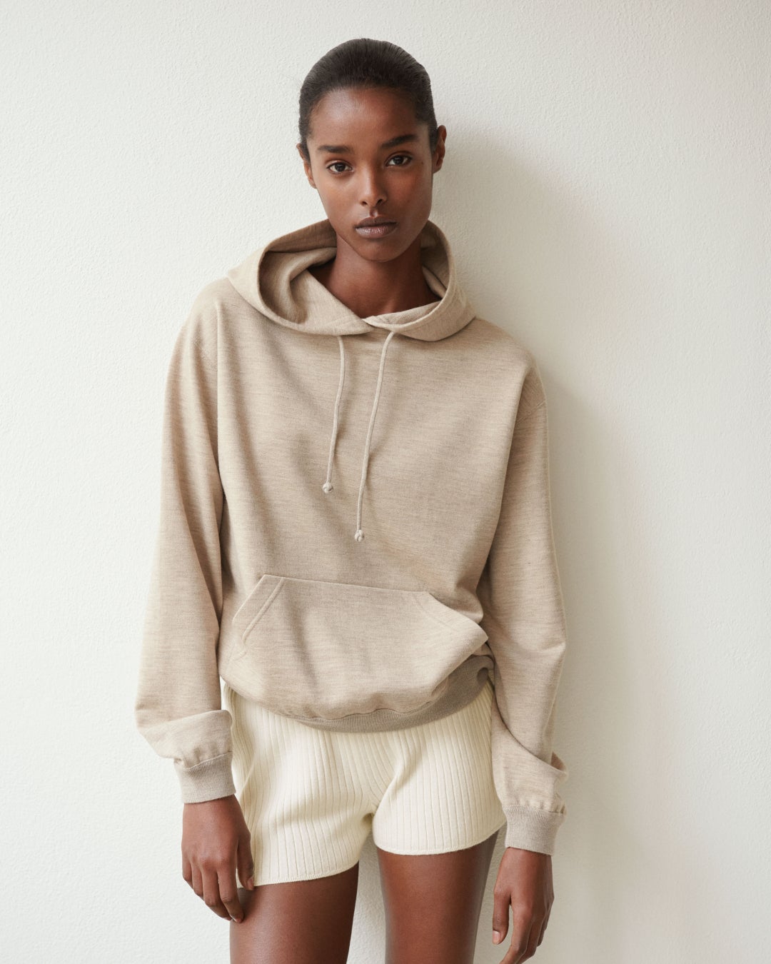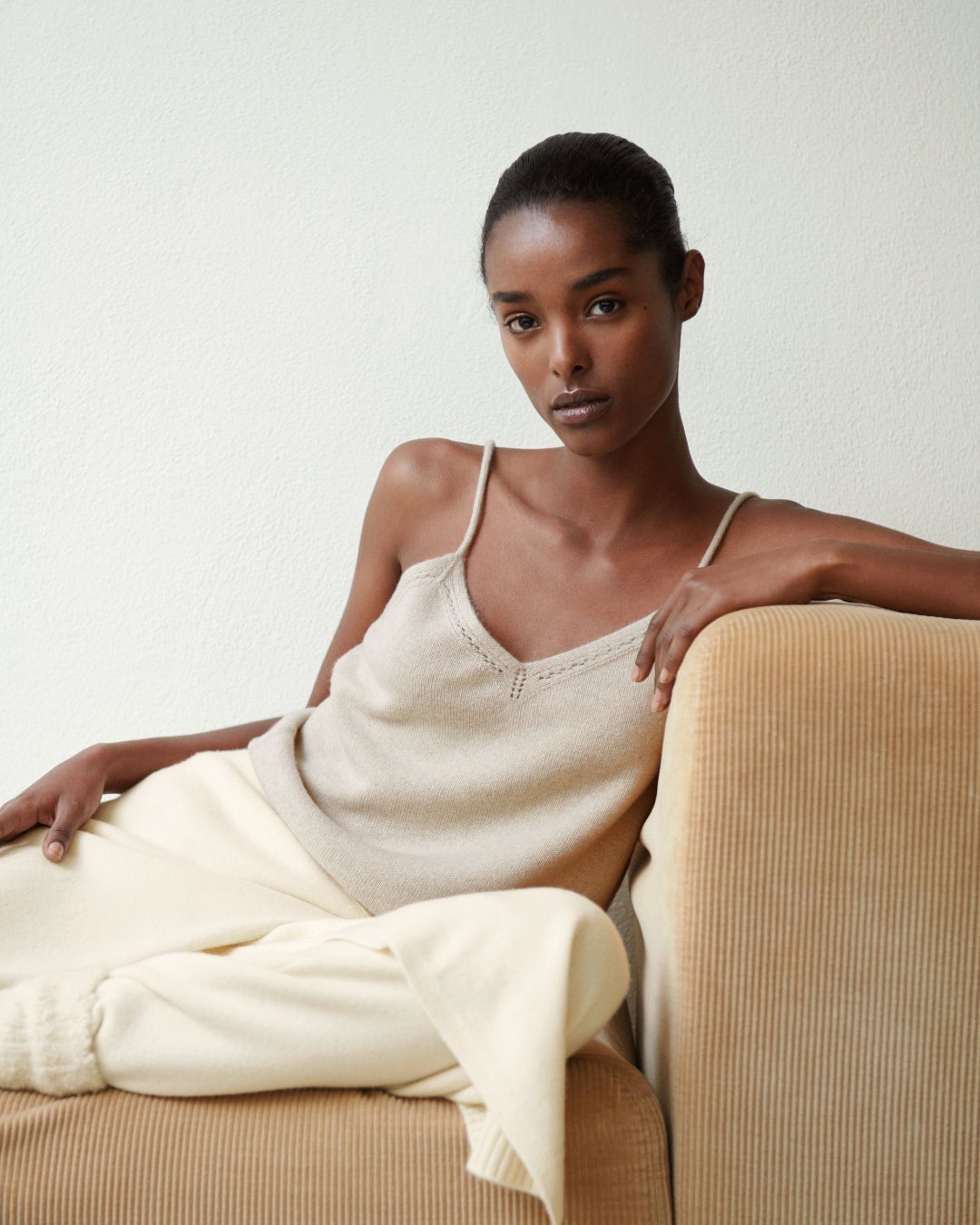 コクーン・コレクションは、内側と外側の概念を覆し、アンダーウェアのフォルムをニットウェアでご提案します。見慣れたスタイルに意外な素材を用いることにより、ロロ・ピアーナが追求する多様な感覚と調和が表現されています。カシミヤのスリップドレス、パンツ、ショーツに、クロップトップス、キャミソール、ロングカーディガン、フーディ、タートルネック。カーディガン、ショーツ、ソックス、タイハイソックスには、リブ編みで素材感とリズムを添えます。ホームブーツ、柔らかいカシミヤのホームスリッパ、ニットブールなどのアクセサリーまで滑らかな心地よさは貫かれています。