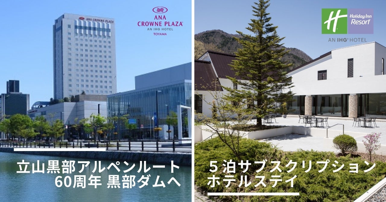 IHGホテルズ& リゾーツが展開する「ANA ホリデイ・インリゾート信濃大町くろよん」と「ANA クラウンプラザホテル富山」がコラボレーションし、各館限定60セットの5泊サブスクリプション型プラン「シティ&リゾートステイ Connected by 立山黒部アルペンルート」を2023年4月15日より販売いたします。