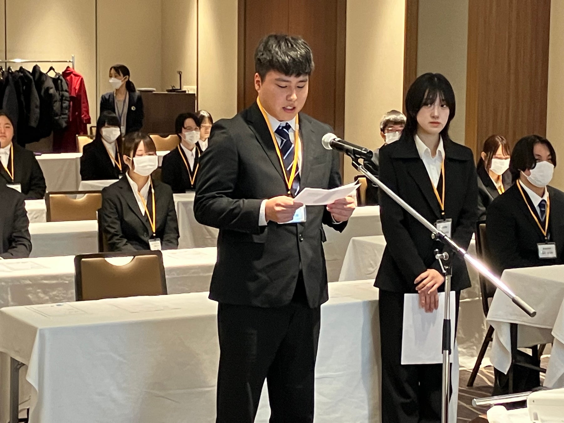 各取締役からの挨拶、辞令交付を経て、最後は新入社員を代表して、小田嶋みやびさん(当社)から「わからないことばかりではありますが、新入社員一同、やる気をもって業務に励んでいきます」、堀場風雅さん(昭和冷凍)からは「1日でも早く戦力になれるように、チャレンジすることを忘れず会社の発展に貢献します」との力強い決意表明が行われ式典は無事終了しました。