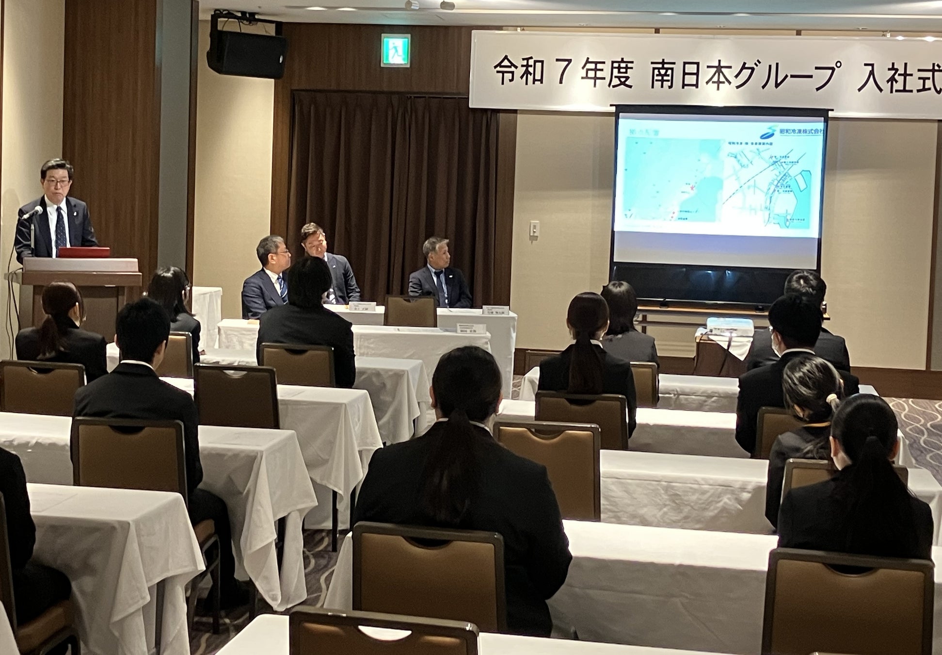 続いて昭和冷凍代表取締役社長の岡田からは業務内容や拠点紹介の説明に加えて「円滑なコミュニケーションを取るためには相手を尊重することが大切です。そうすることで悩んだり、迷ったりしたときに相談できる環境が整います。それが次の一歩につながっていきます。頑張ってください」との激励の言葉を贈りました。