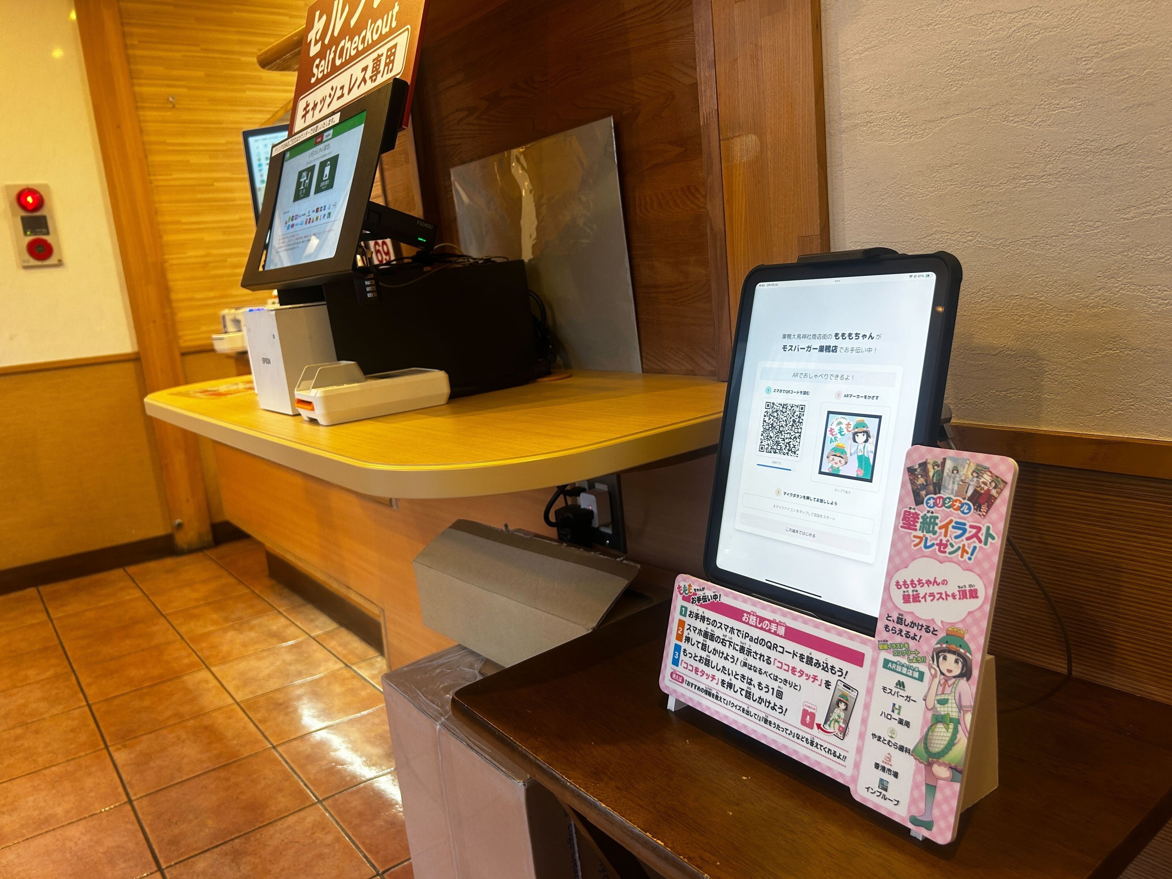 いつものお店に、新しいお友達がやってきたよ! ハンバーガー屋さん、歯医者さん、お薬屋さん……商店街のいろんな場所に『もももちゃん』のiPadが置いてあります。