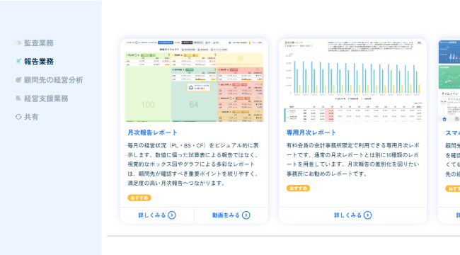 株式会社YKプランニングが企画・開発・販売・サポートする経営支援クラウドです。多種多様な会計ソフトのデータに対応し、会計データの自動チェック機能から月次の経営状況の把握・現状分析や経営計画の作成など多彩なコンテンツを提供しています。また、企業や会計事務所だけでなくコンサルタント、金融機関等とデータを共有する機能も備えており、無料でご利用を開始していただけるようになっています。インターネットブラウザやスマホ・タブレットなどマルチデバイス対応をしています。