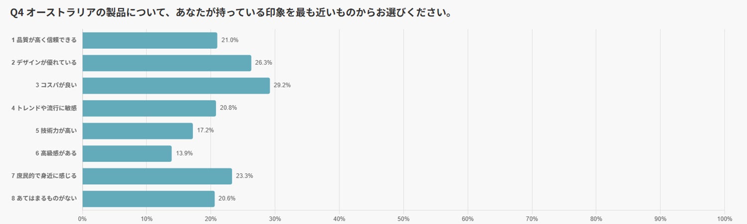 オーストラリア製品は、「コスパが良い」(29.2%)が最も多く、「庶民的で身近」(23.3%)が続きました。
