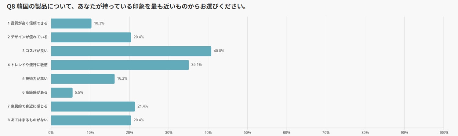 「コスパが良い」(40.8%)、「トレンドに敏感」(35.1%)が上位を占め、「デザインが優れている」(20.4%)も比較的高い結果となりました。