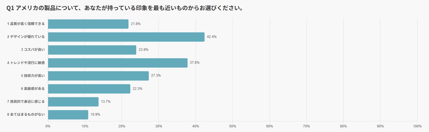 アメリカ製品に対しては、「デザインが優れている」(42.4%)や「トレンドに敏感」(37.8%)と回答した人が多く見られました。