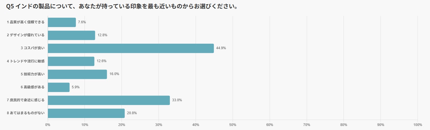 インド製品では、「コスパが良い」(44.9%)が最も多く、「庶民的で身近」(33.0%)が続きました。