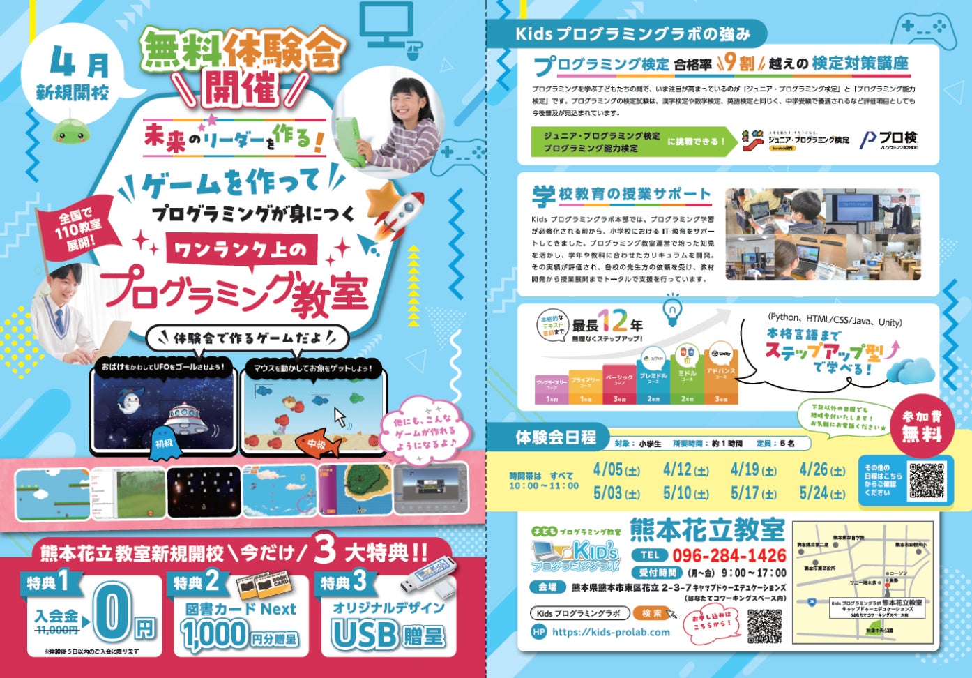 「Kidsプログラミングラボ熊本花立教室」では、2025年4月より無料体験会を開催しております。