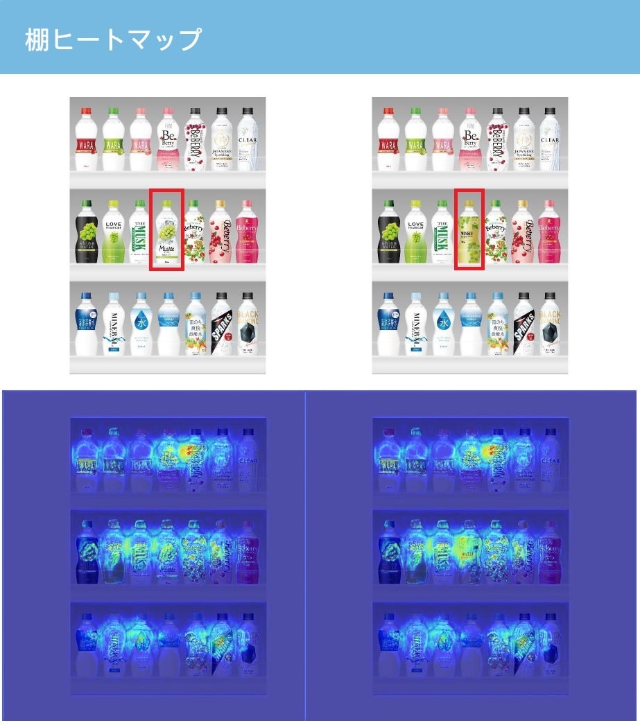 商品棚の画像をWEBにアップロードするだけで、注視される部分をヒートマップで可視化します。
