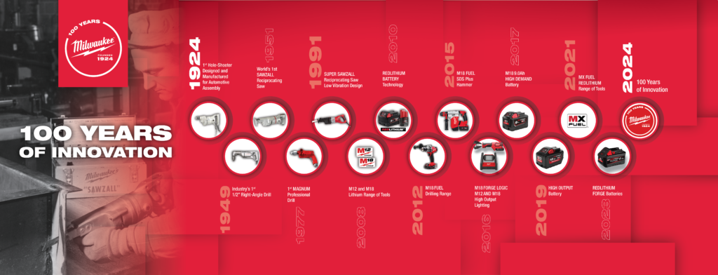1924年にアメリカウィスコンシン州ミルウォーキーで創業したミルウォーキーツールは建設業界で働くプロフェッショナルに高耐久、長寿命の電動工具を提供し、革新的な技術で現場での生産性の向上に貢献し続けてきました。2024年は創業100周年のアニバーサリーイヤー!次の100年に向け新たなイノベーションを提供し続けて参ります。