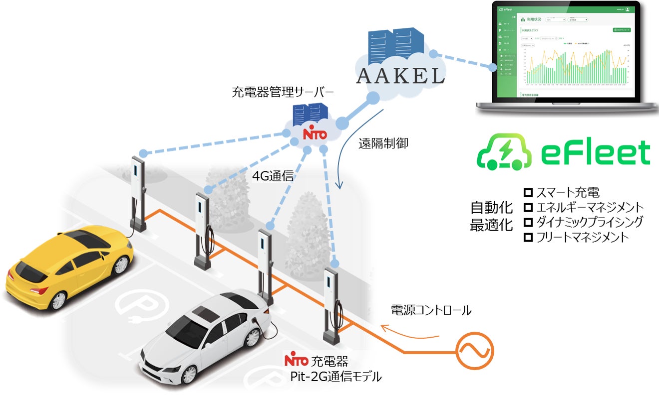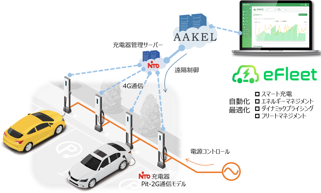 この連携により、EV充電器Pit-2G通信モデルにおいて、EVのスマート充電と複雑な運行管理をすべて一括管理・自動化する「AAKEL eFleet」の機能を利用することが可能となりました。「AAKEL eFleet」は、脱炭素化に向けてEVを導入する企業・自治体のお客様を対象に、「ダイナミックプライシング」「フリートマネジメント」「エネルギーマネジメント」等のシステムと「スマート充電」を組み合わせ、EV充電と運行管理を最適化、自動で一括管理する国内初のシステムです。