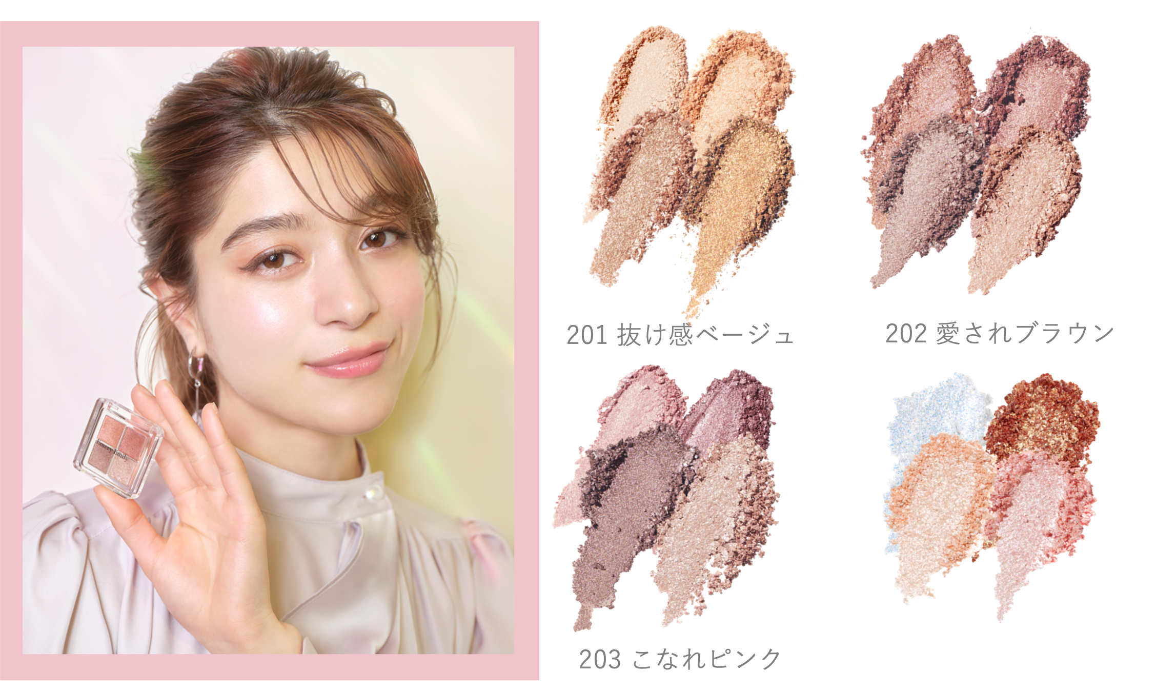 捨て色がなく間違いないカラーで毎日使いができる3パレットと、いつものメイクにプラスするだけで旬顔が作れる、ラメだけを詰め込んだ、1パレット。全4パレットでの展開です。