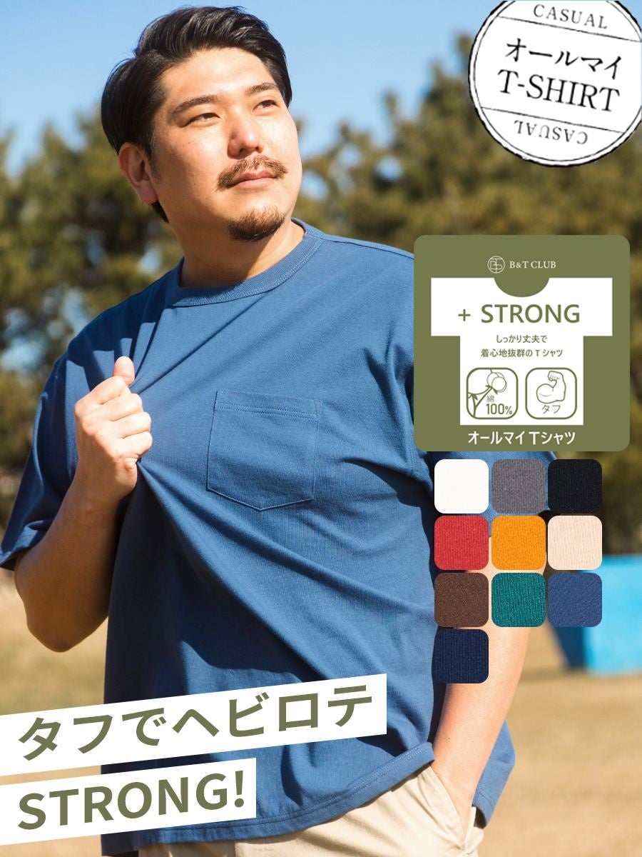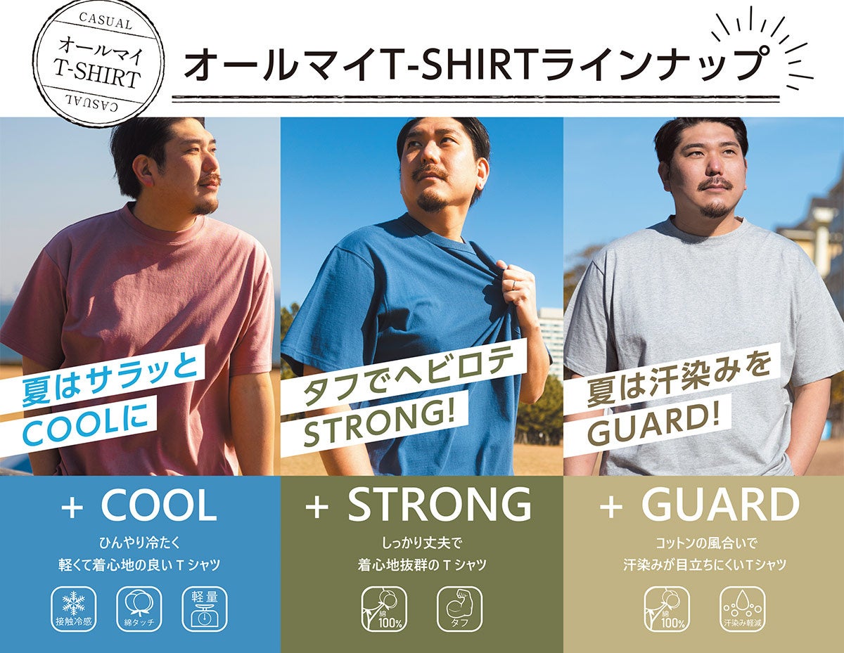 ⼤きいサイズのユーザーへ「気の利いた機能性とファッションの楽しさを。」コンセプトに展開しているオリジナルブランド“B&T CLUB“より、暑い時期には欠かせない機能を施した新ベーシックTシャツ「オールマイT-shirt」を発売。これまで、お客様より「汗染みが気になる」「洗濯するとすぐにへたれてしまう」「ひんやりとした商品がほしい」など汗ばむ時期のファッションについてのお悩みが多く寄せられていました。そこで、これらの課題を解決しファッションを全力で楽しんでほしいという思いから生地や縫製、機能性にこだわり誕生しました。着た瞬間にひんやりと感じられる接触冷感のオールマイTシャツ +COOL、タフな生地感のオールマイTシャツ +STRONG、汗染み軽減加工を施したオールマイTシャツ +GUARDの3素材を軸に展開し汗ばむ時期でも幅広いファッションをお届けしていきます。機能性を活かした新しいベーシックTシャツをお楽しみください。