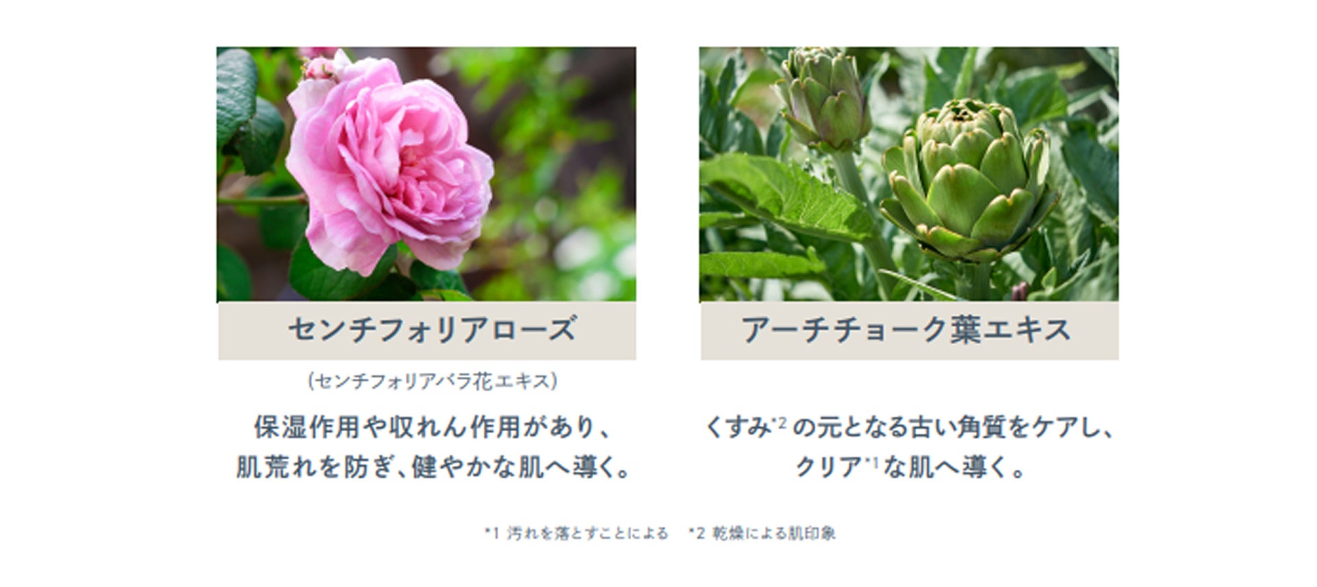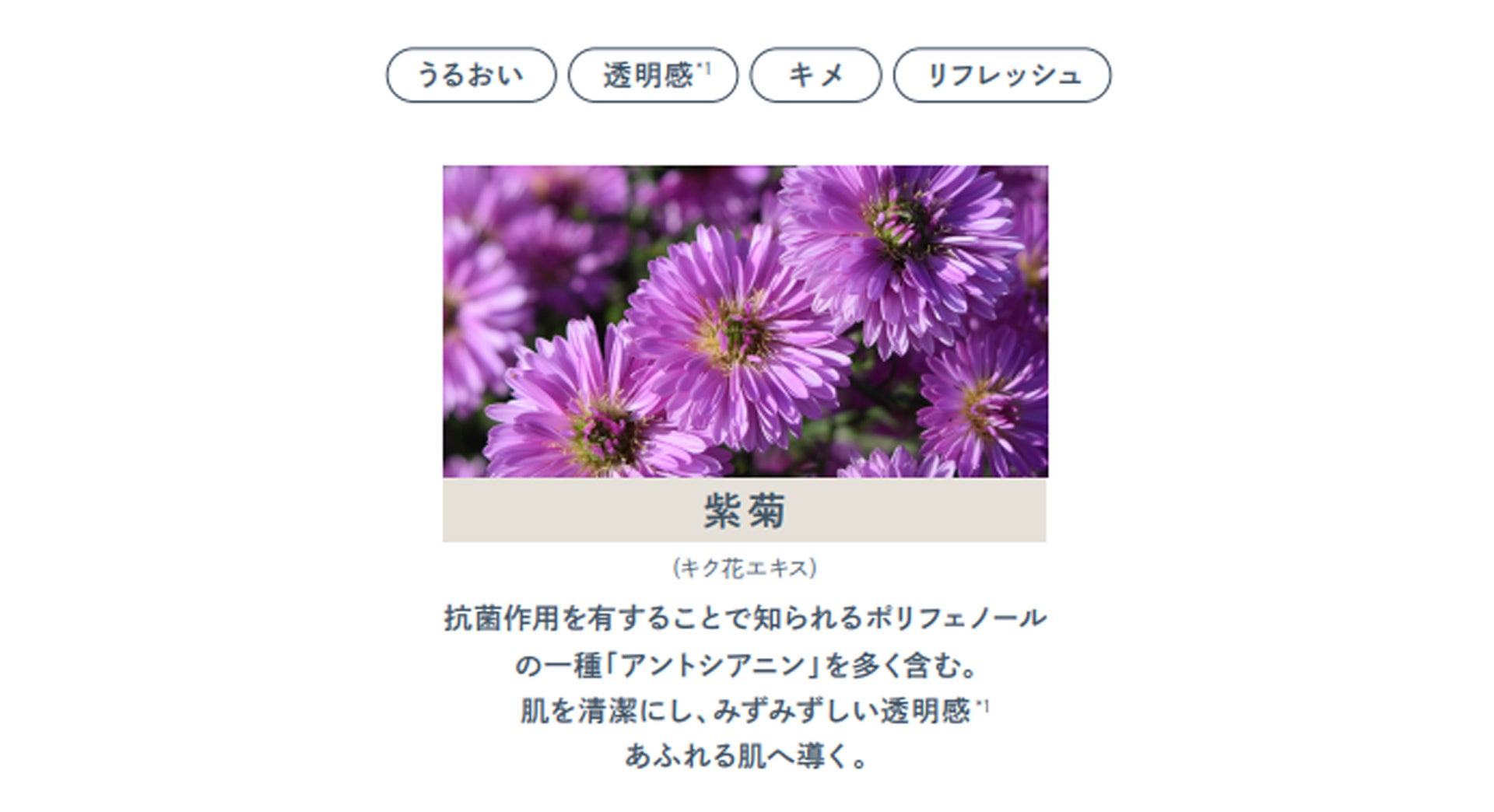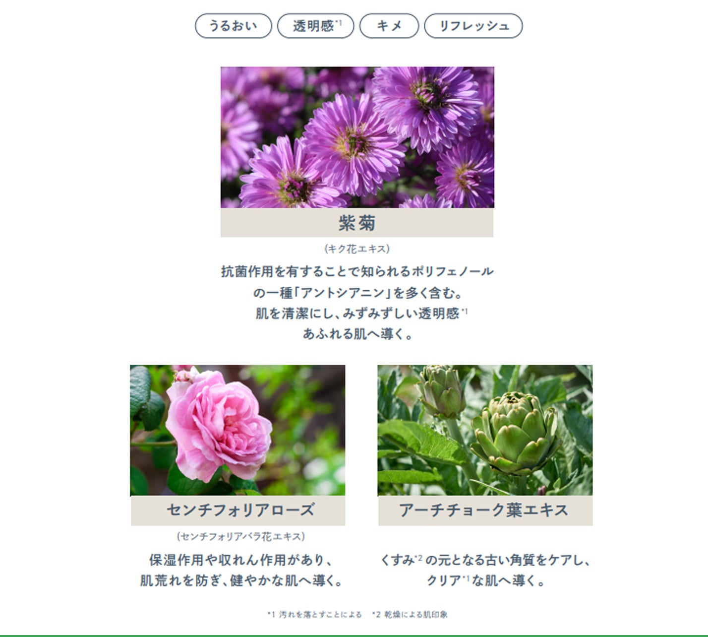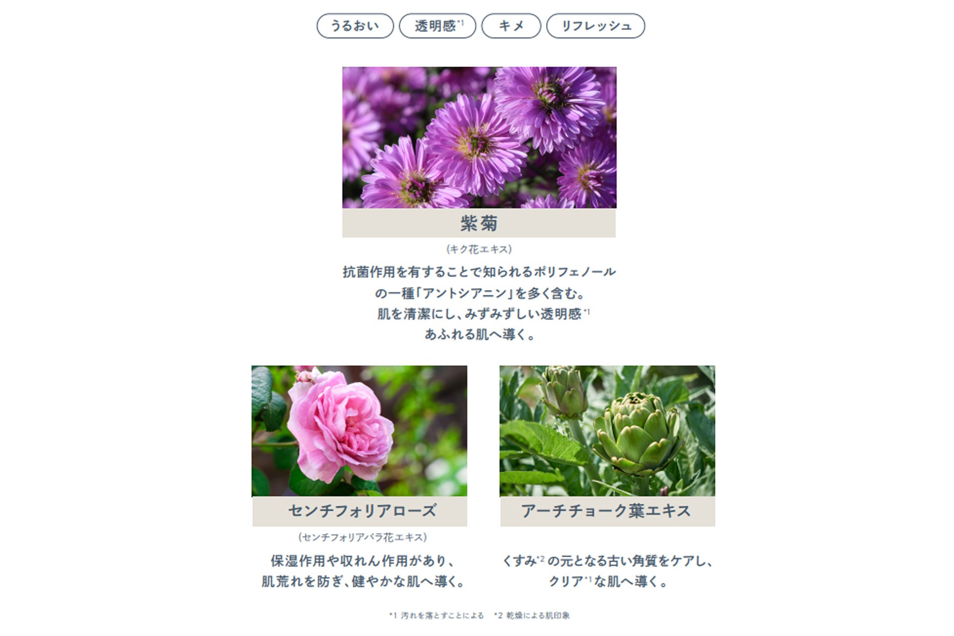 東三河産の紫菊・センチフォリアローズ*³も新配合し、うるおいと透明感*⁴あふれる肌へ。