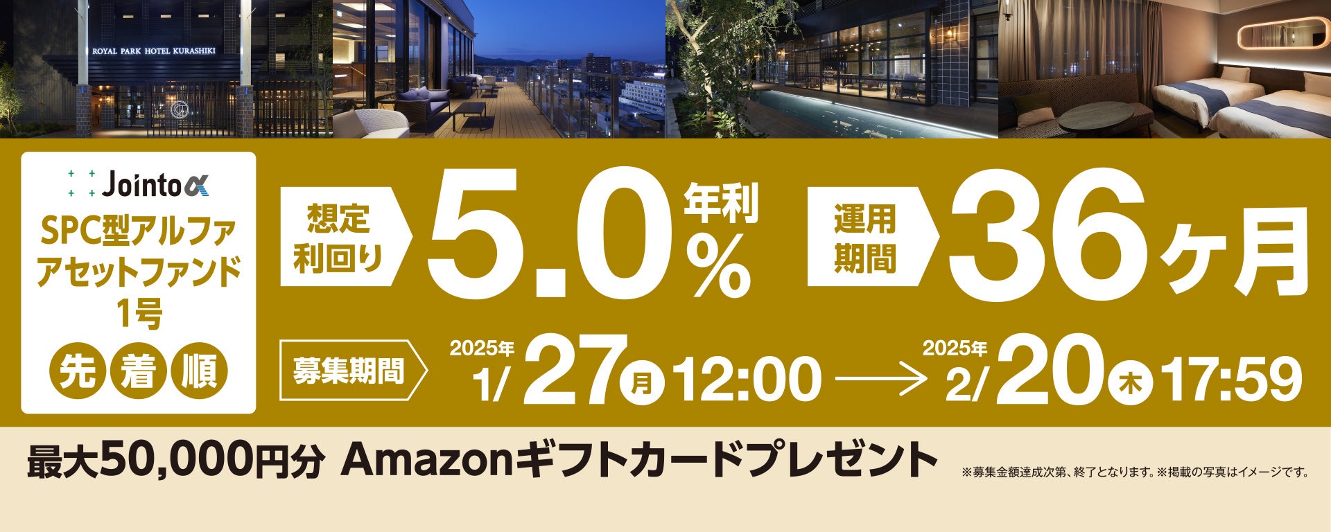 SPC型アルファアセットファンド1号は、募集金額1,164,500千円の大型ファンドとなり、Jointo αの過去の商品の中でも大規模なプロジェクトとなりますが、多くの方にご投資を頂き、募集金額を達成いたしました。