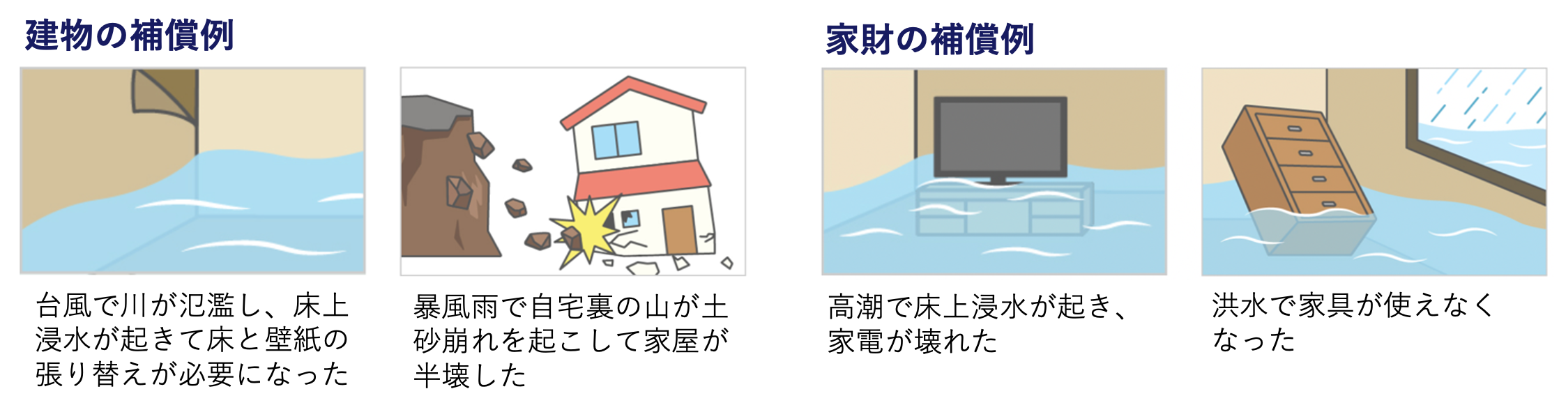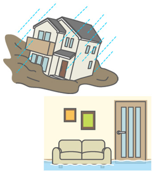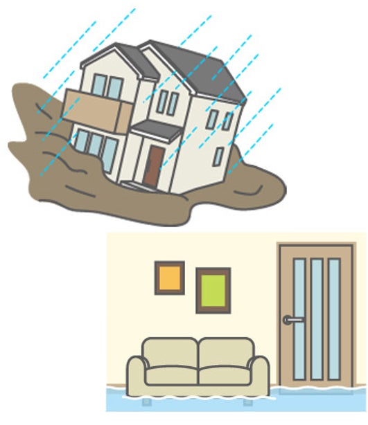 台風や暴風雨などが原因で起こる洪水・高潮・土砂崩れなどにより、建物や家財に再調達価額*の30%以上の損害が生じたとき、または建物が床上浸水もしくは地盤面より45cmを超える浸水となった結果、損害が生じたときに、保険金を支払います。