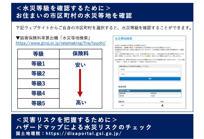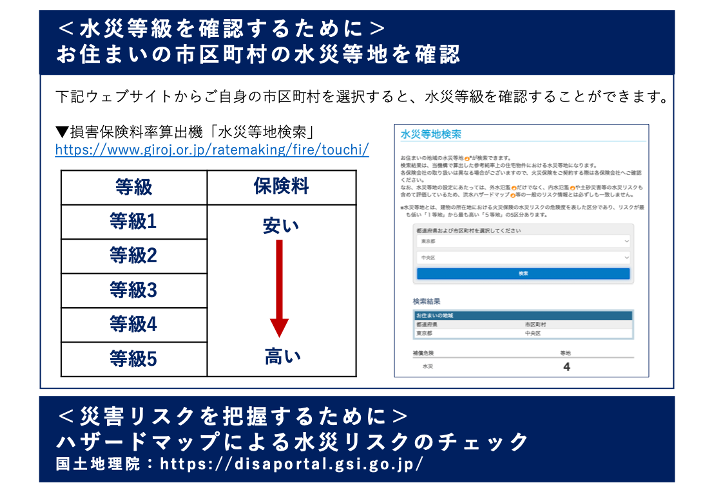 料率改定に先立って、損害保険料率算出機構のウェブサイト上で、お住まいの市区町村がどの水災等地に分類されるかを検索することができます。居住エリアの水災リスクを把握し、補償内容の見直しの参考にしてみてはいかがでしょうか。なお、水災等地の区分は永続的なものではなく、今後の自然災害の状況等に合わせて適宜見直しが行われる予定です。