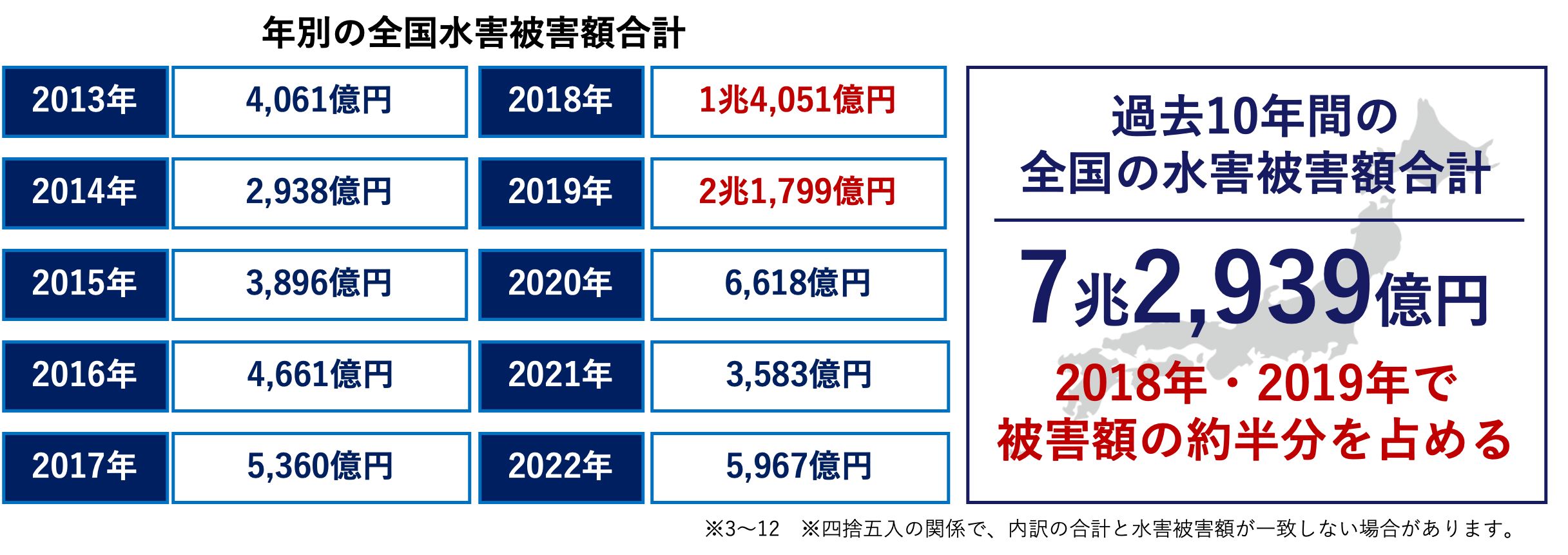 近年の自然災害の増加や異常気象が要因と考えられますが、そのなかでも通称「平成30年7月豪雨」と呼ばれる西日本を中心に発生した大雨と「令和元年東日本台風」が大きく影響しています。