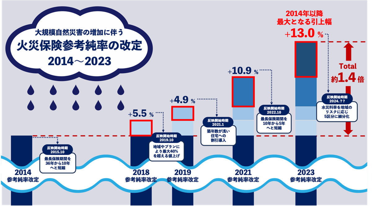 こうした自然災害の影響を受けて、2024年度を目処に火災保険料が改定される見通しです。毎年のように自然災害による被害が全国各地で多発しており、保険金の支払いが増加傾向にあるためです。2023年の参考純率の改定は、2014年以降最大となる全国平均で13.0%の引上げとなり、各社の火災保険料に順次反映される見込みです。