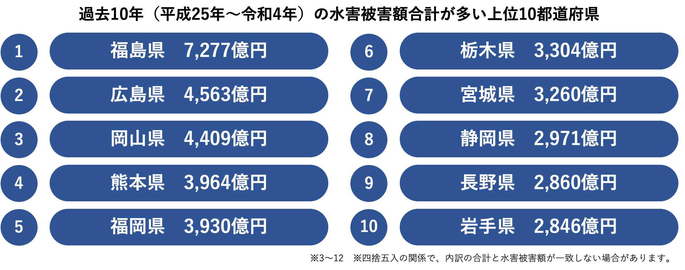 国土交通省が毎年公表している、過去10年間(平成25年~令和4年)の都道府県別の水害被害額を集計すると、福島県が最も多いことがわかりました。その額は7,000億円を超え、2位の広島県と比較すると、その差は約2,700億円と非常に大きくなっています。上位5県をみると、福島県以外の広島県・岡山県・熊本県・福岡県は西日本に属しており、西日本で水害被害額が大きい傾向にあることがわかります。6位から10位は東日本に属する都道府県が続き、被害額は3,000億円前後となっています。