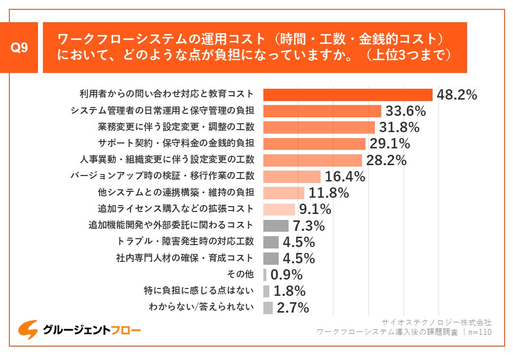 「Q9.ワークフローシステムの運用コスト(時間・工数・金銭的コスト)において、どのような点が負担になっていますか。(上位3つまで)」(n=110)と質問したところ、「利用者からの問い合わせ対応と教育コスト」が48.2%、「システム管理者の日常運用と保守管理の負担」が33.6%、「業務変更に伴う設定変更・調整の工数」が31.8%という回答となりました。