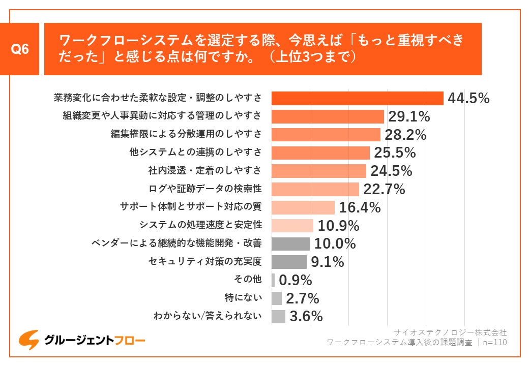 「Q6.ワークフローシステムを選定する際、今思えば『もっと重視すべきだった』と感じる点は何ですか。(上位3つまで)」(n=110)と質問したところ、「業務変化に合わせた柔軟な設定・調整のしやすさ」が44.5%、「組織変更や人事異動に対応する管理のしやすさ」が29.1%、「編集権限による分散運用のしやすさ」が28.2%という回答となりました。