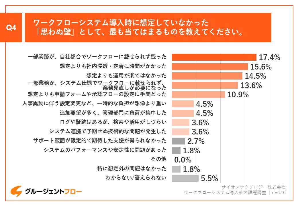 「Q4.ワークフローシステム導入時に想定していなかった『思わぬ壁』として、最も当てはまるものを教えてください。」(n=110)と質問したところ、「一部業務が、自社都合でワークフローに載せられず残った」が17.4%、「想定よりも社内浸透・定着に時間がかかった」が15.6%、「想定よりも運用が楽ではなかった」が14.5%という回答となりました。