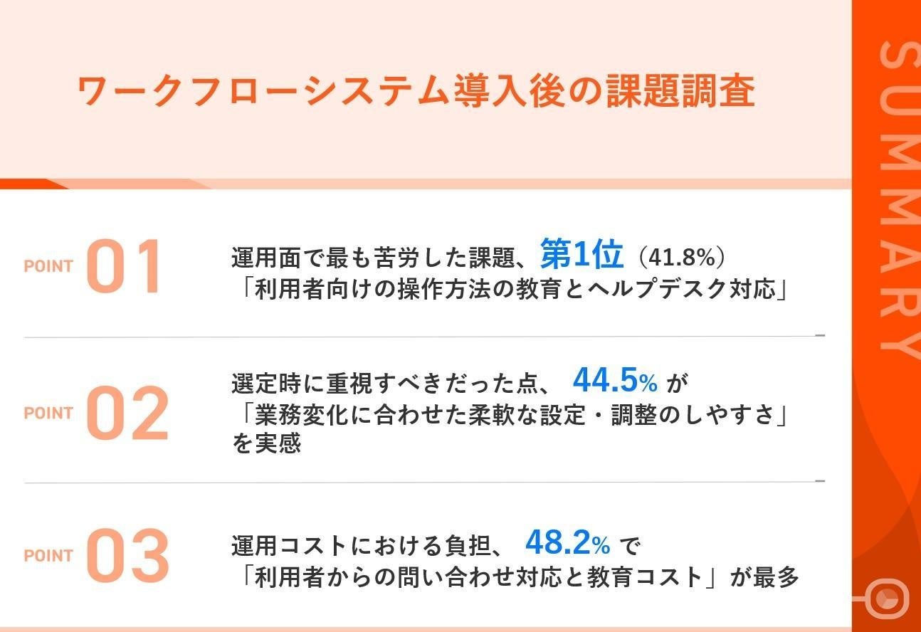 今回の調査では、ワークフローシステム導入企業の多くが、導入後の社内運用に課題を抱えており、社内浸透の難しさや利用者からの問い合わせ・ユーザー教育に多大な工数を割かざるを得なかった実態が浮き彫りになりました。