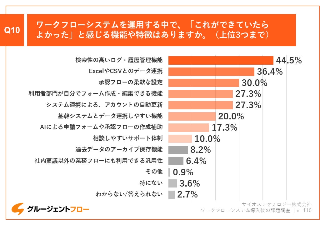 「Q10.ワークフローシステムを運用する中で、『これができていたらよかった』と感じる機能や特徴はありますか。(上位3つまで)」(n=110)と質問したところ、「検索性の高いログ・履歴管理機能」が44.5%、「ExcelやCSVとのデータ連携(インポート・エクスポート)」が36.4%、「承認フローの柔軟な設定」が30.0%という回答となりました。