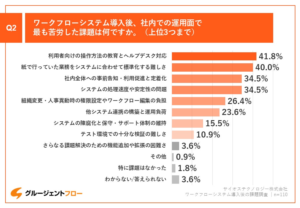 「Q2.ワークフローシステム導入後、社内での運用面で最も苦労した課題は何ですか。(上位3つまで)」(n=110)と質問したところ、「利用者向けの操作方法の教育とヘルプデスク対応」が41.8%、「紙で行っていた業務をシステムに合わせて標準化する難しさ」が40.0%という回答となりました。
