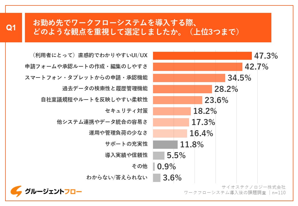 「Q1.お勤め先でワークフローシステムを導入する際、どのような観点を重視して選定しましたか(上位3つまで)」(n=110)と質問したところ、「(利用者にとって)直感的でわかりやすいUI/UX」が47.3%、「申請フォームや承認ルートの作成・編集のしやすさ」が42.7%、「スマートフォン・タブレットからの申請・承認機能」が34.5%という回答となりました。