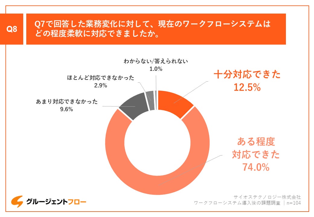 Q7で「特に変化はなかった」「わからない/答えられない」以外を回答した方に、「Q8.Q7で回答した業務変化に対して、現在のワークフローシステムはどの程度柔軟に対応できましたか。」(n=104)と質問したところ、「十分対応できた」が12.5%、「ある程度対応できた」が74.0%という回答となりました。