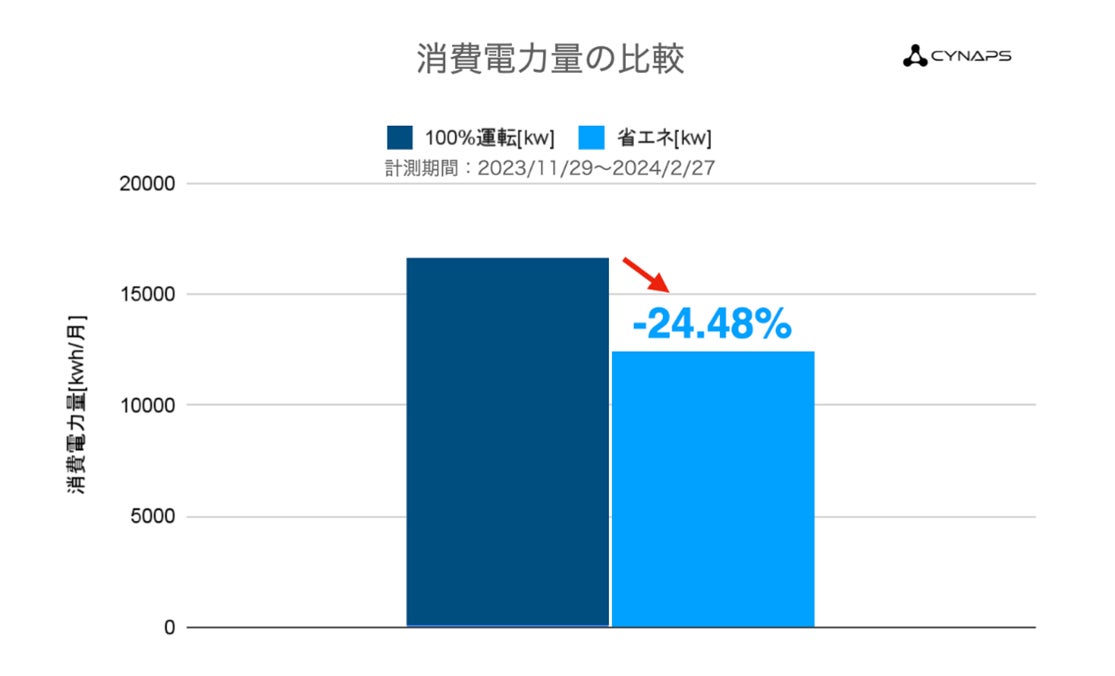 業務用空調はON/OFFの切替のみで微調整できないものが一般的ですが、cynapsが開発したIoTインバーター制御技術では、空気環境に応じた換気量の調整が可能です。本格運用開始後は換気削減量を徐々に増やし、快適な空気環境を保ちながら無駄な空調エネルギーを最大限削減していく予定です。