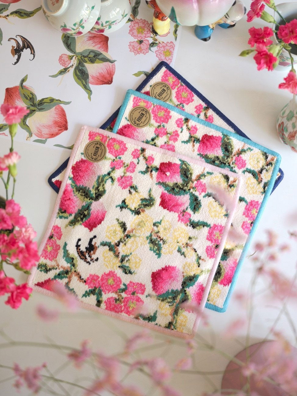 旬な季節の桃テキスタイルを使用した華やかなデザインは自身にはもちろんギフトにもぴったり。