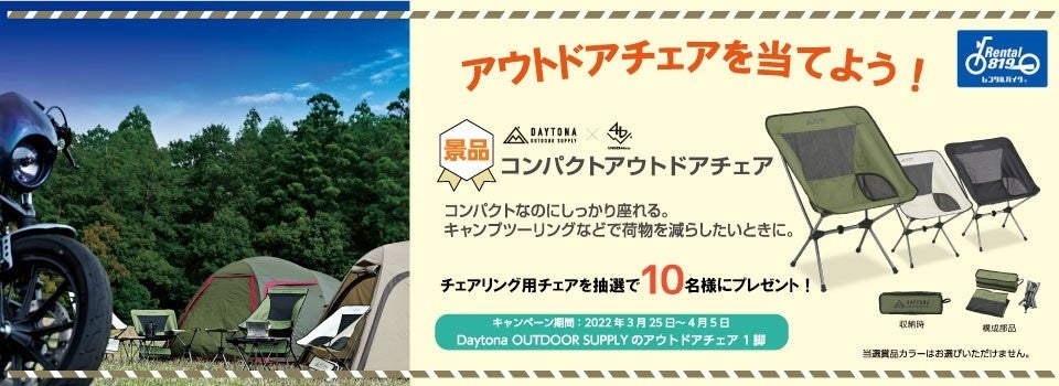 オートバイの全国レンタルサービス『レンタル819』は、バイクシーズンに入った今、チェアリングおすすめ企画として2022年3月25日(金)から4月5日(火)までの期間、アウトドアチェアが当たる「アウトドアチェアを当てようキャンペーン」をTwitterで実施します。
