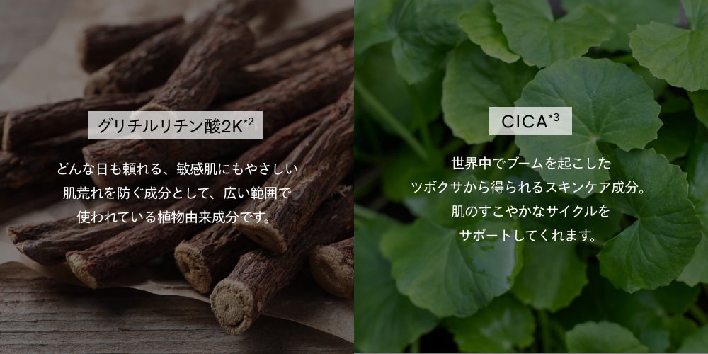 肌をすこやかに整えるために、甘草から得られるグリチルリチン酸2K*2とツボクサから得られるCICA*3をサポート保湿成分として配合。肌荒れを防ぎ、素肌の美しさをサポートします。