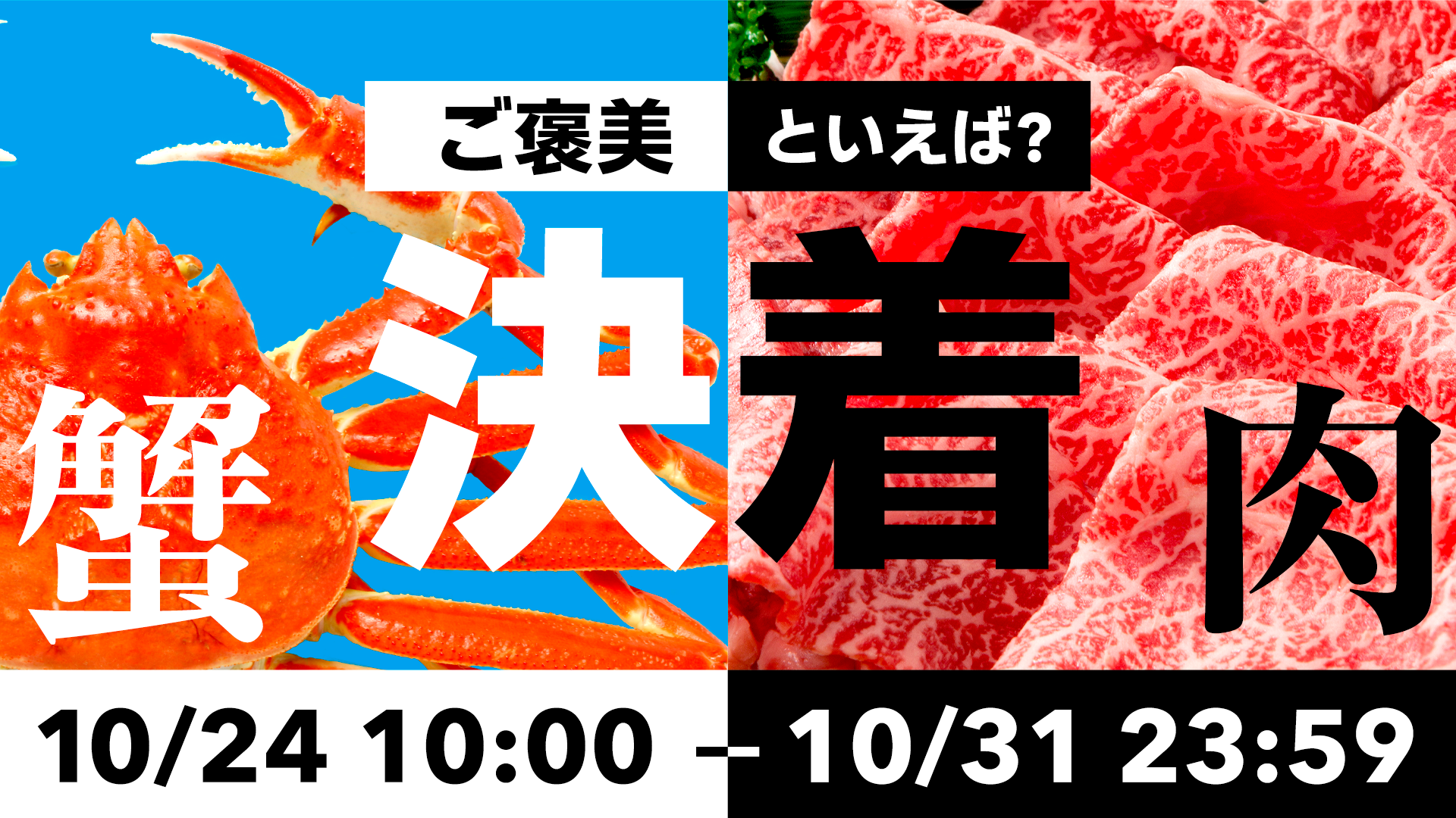 蟹と肉、2つの対象商品群で、シェア買い人数に応じて割引率が変動するキャンペーンです。勝敗に関わらず、それぞれのシェア買い人数に応じた割引率で対象商品群をご購入いただけます。